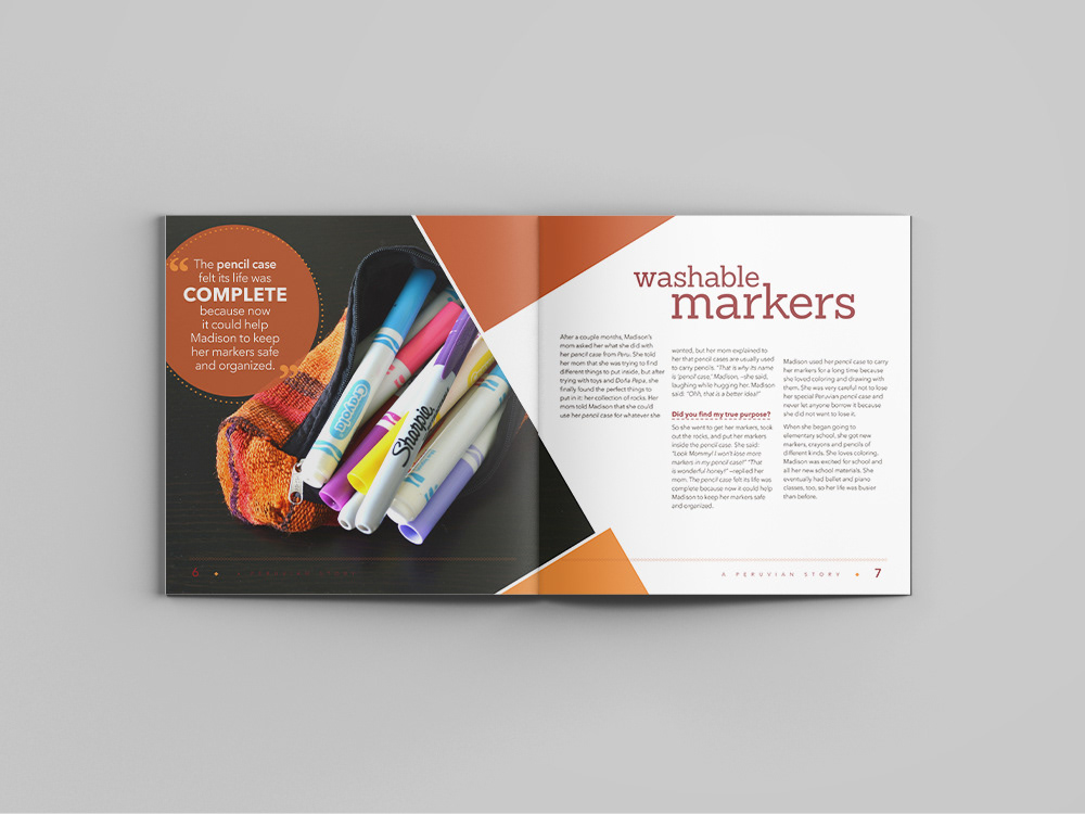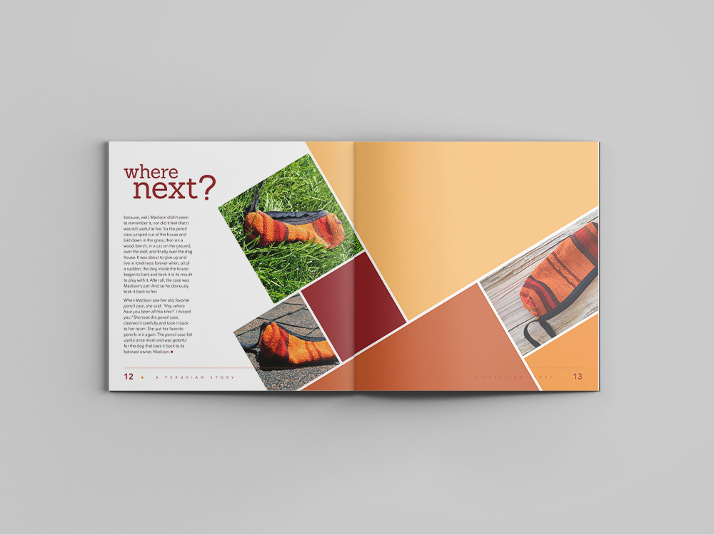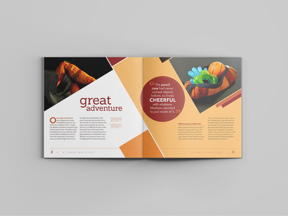 The forgotten Pencil Case story was created from a series of pictures of a pencil case made in Cusco, Peru. The photographs were taken in different backgrounds, image editing was done to enhance the pencil case, layout design was done in Adobe InDesign and the story was exclusively created for this project by Sofia Atwood.