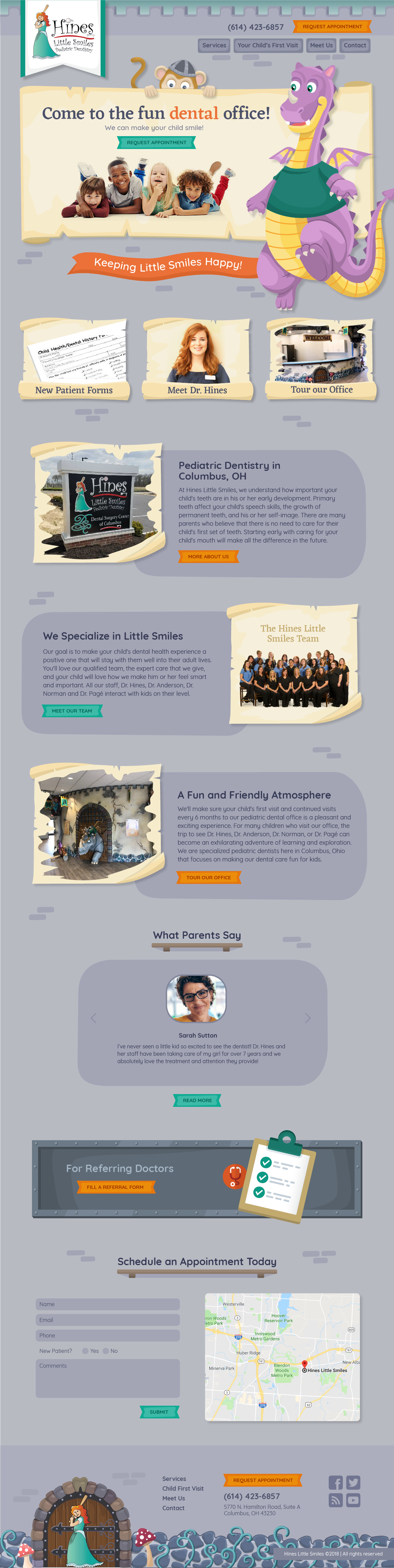 The Hines dental practice moved to a new modern themed office with lots of fairy tale characters. This website was created using the pictures from their new office location, and all illustrations were made from sketch to digital.