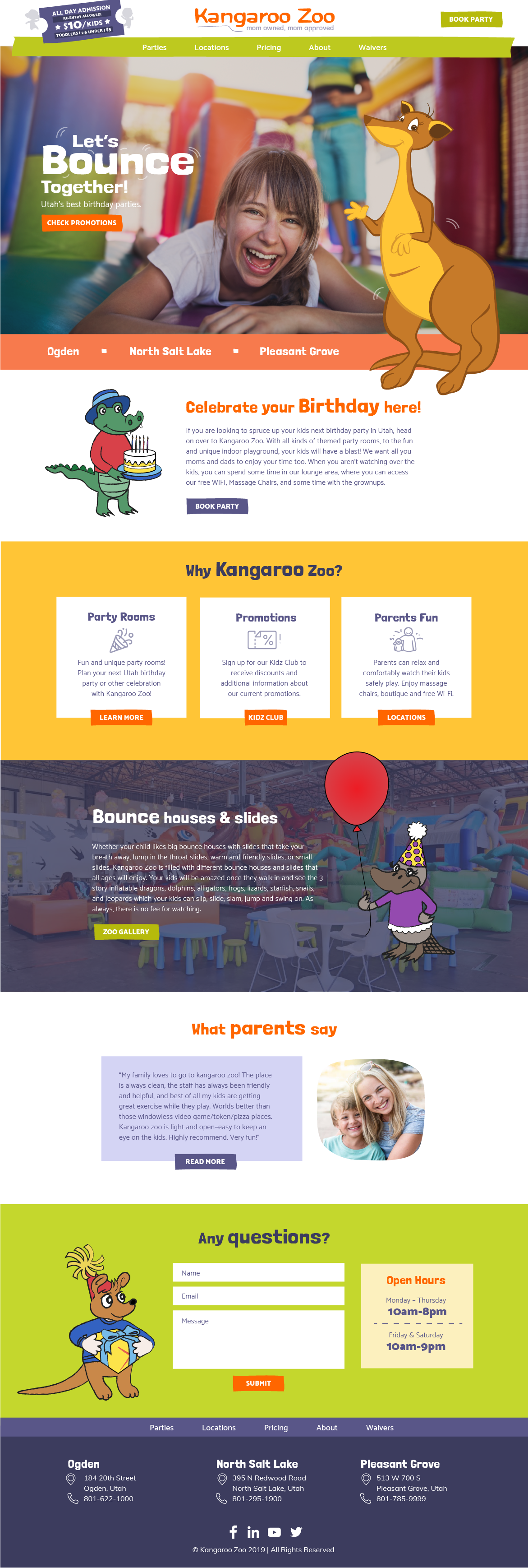 Website redesign for a bouncy house playground company. The kangaroo illustration was improved and updated.
