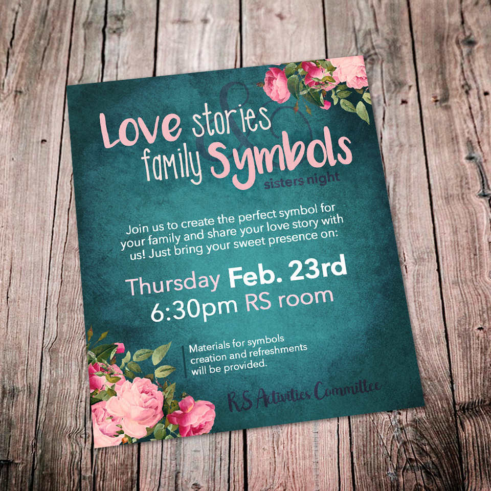 Love stories flyer. This flyer was created last month for a women's craft and social activity. The theme was inspired by love stories and family symbols.