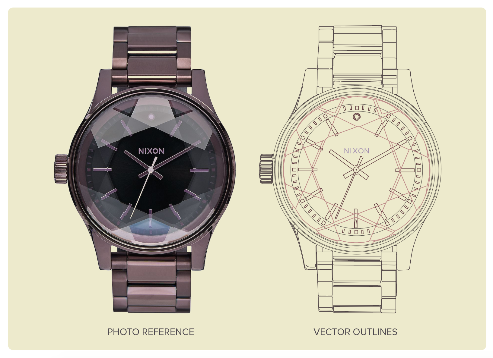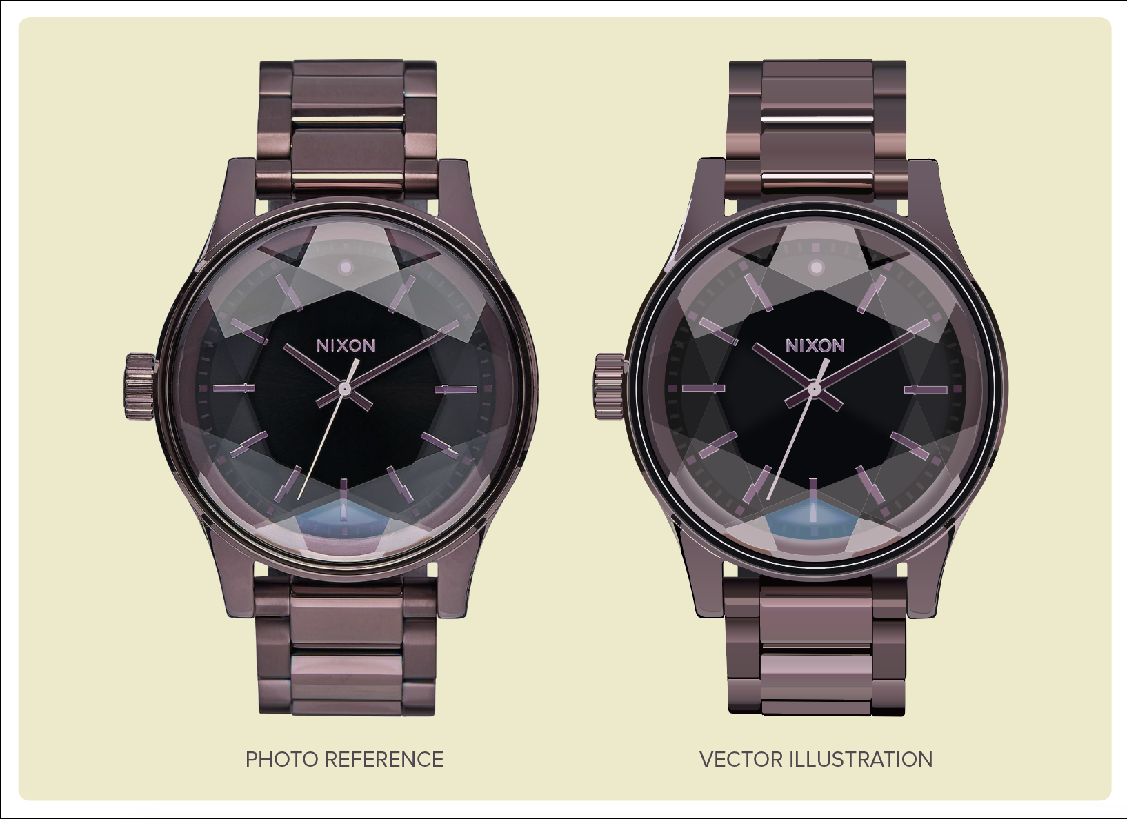 Photo Realistic Vector Illustration. I chose this Nixon watch for my project because the reflection on the different faces of the glass makes an interesting effect that I wanted to follow and learn how to create in vectors. The vector illustration with the vector selected version has three different colors because I have it on three different layers that were very helpful to organize the illustration and add all the needed effects that make it look realistic.