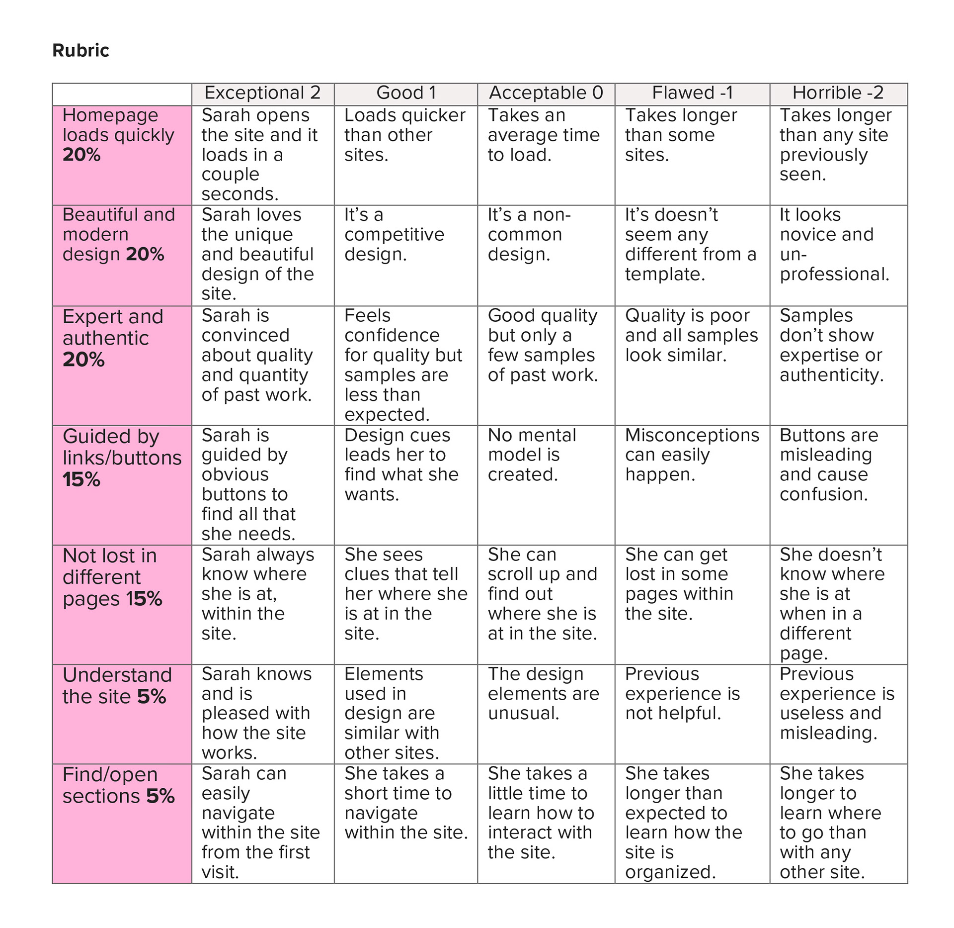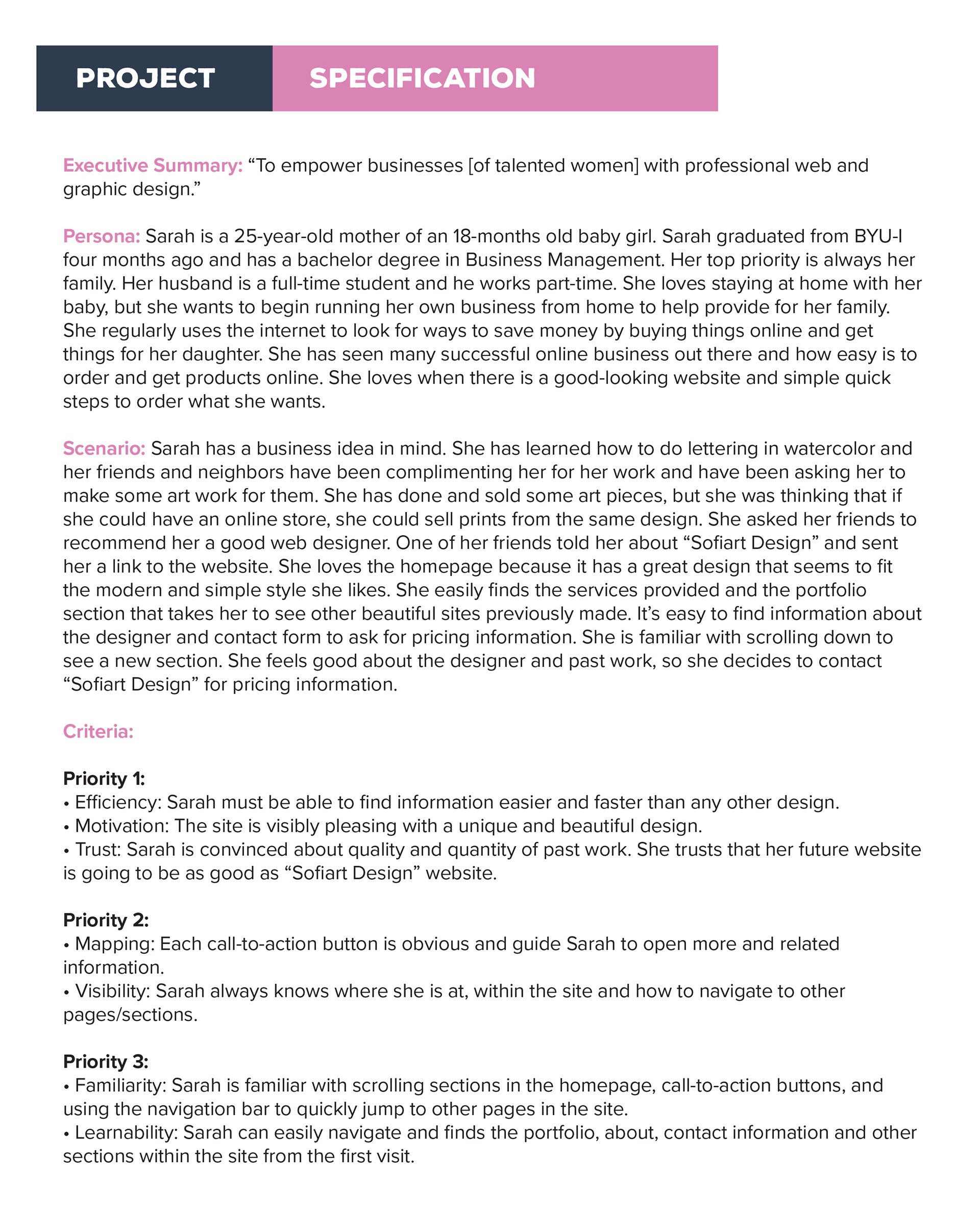 The first step was the analysis of the chosen target audience where an executive summary, persona, scenario, criteria and rubric was create for the project.